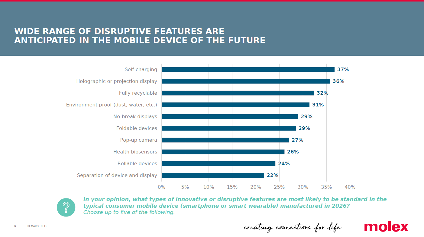 When asked to name five of the most innovative or disruptive features most likely to be standard in a mobile device manufactured in 2026, self-charging (37%) and holographic or projection displays (36%) were the most anticipated features, followed by fully recyclable (32%), environment proof (31%), no-break displays (29%), and foldable devices (29%). Other notable features include pop-up cameras, health biosensors, rollable devices, and separation of device and display.