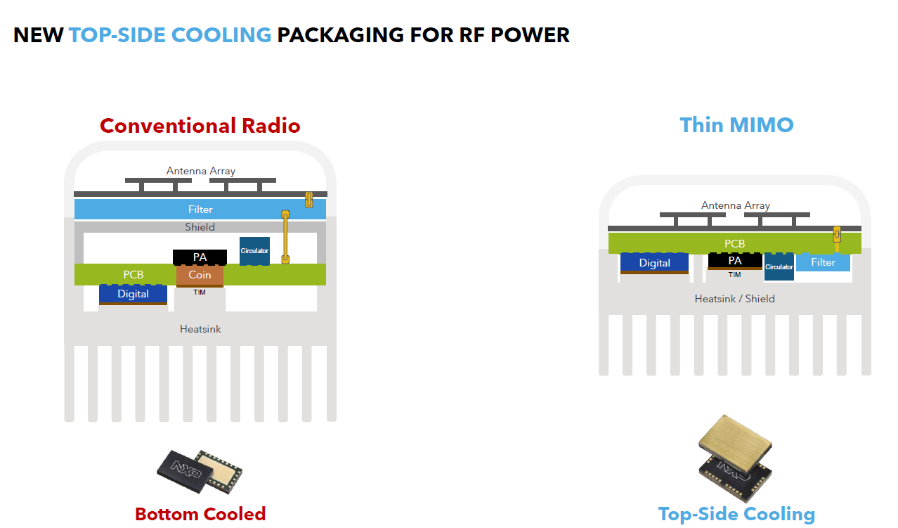 The main difference between a [bottom cooled] conventional radio and [top cooled] thin MIMO is the total quantity of layers associated with the two different types, said Nathan Glaza, integrated power solutions portfolio manager at NXP. “The thin MIMO gives end customers the ability to minimize the design and layers to help make them thinner and lighter.”