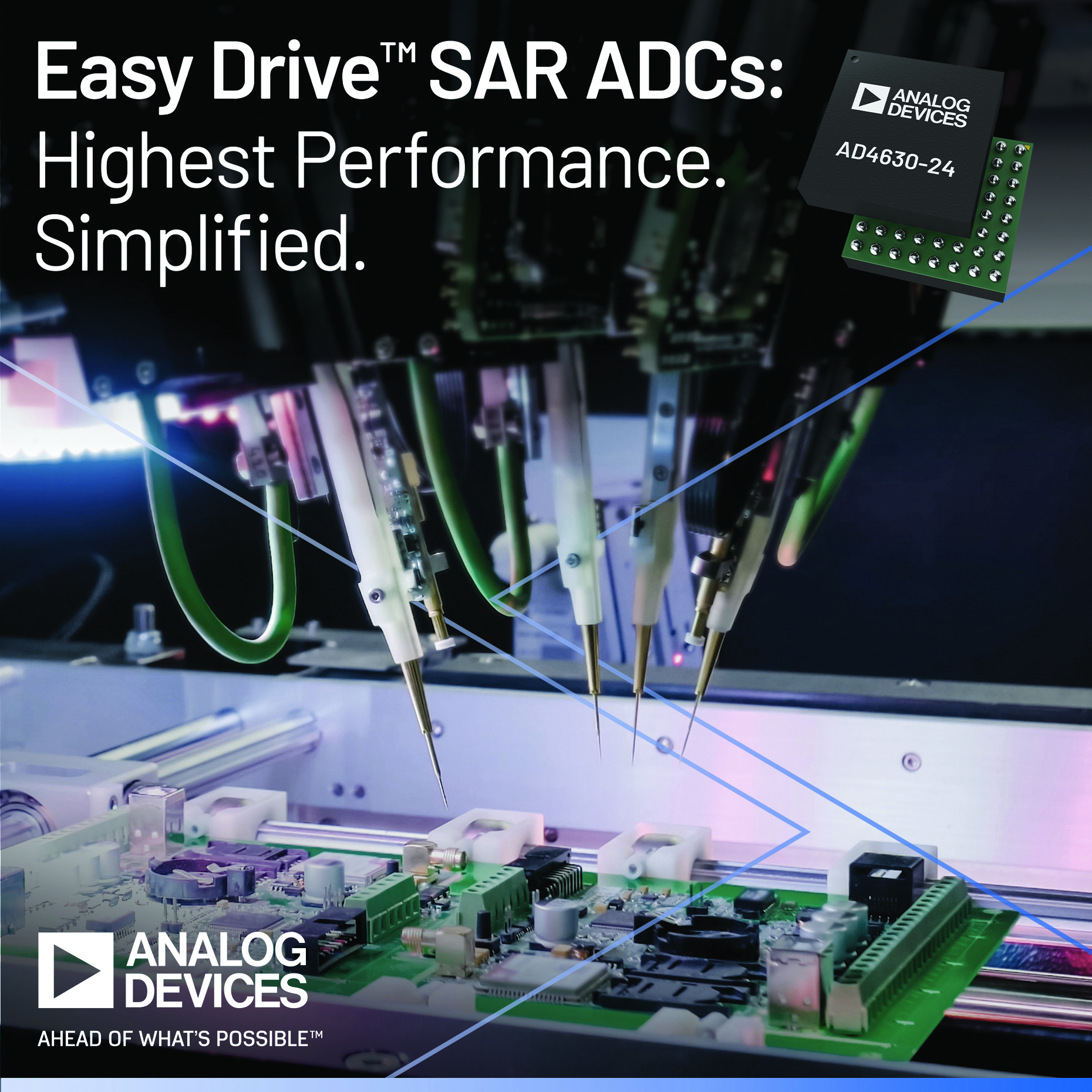 Analog Devices, Inc. (ADI) has introduced a new portfolio of 16-to-24-bit, ultra-high-precision successive approximation register (SAR) analog-to-digital converters (ADCs) that simplify the process of designing ADCs into instrumentation, industrial, and health-care applications. The new family of SAR ADCs feature ADI’s Easy Drive technology and Flexi-SPI serial peripheral interface (SPI) that expands the selection of directly compatible companion products and eases host processor and ADC integration.