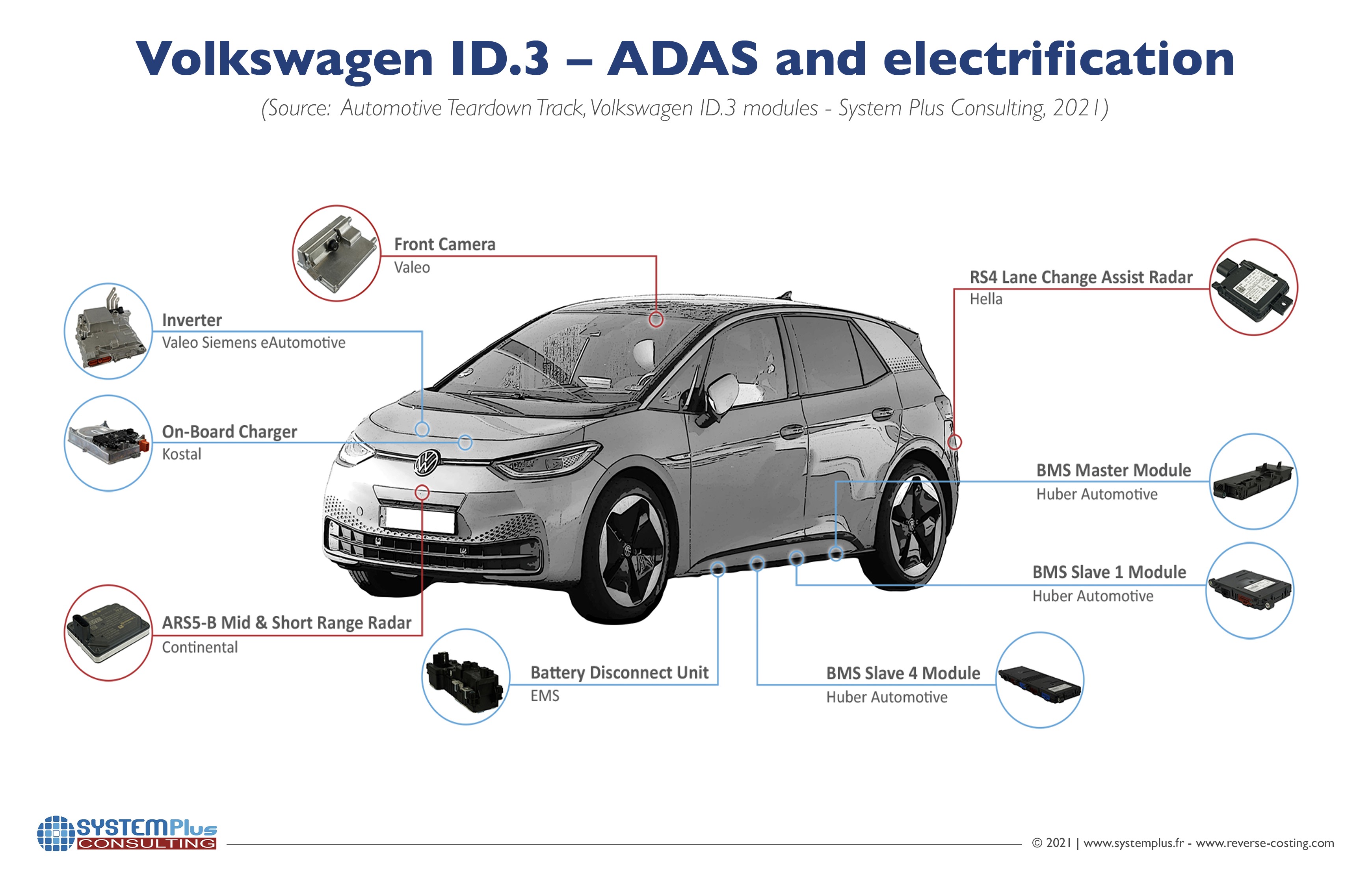 The ID.3 is equipped with a wide range of driver assistance systems. Considered a Level 2 ADAS, the ID.3 leverages the same suppliers and, in most cases, the same components as the Golf 8, previously evaluated by System Plus Consulting, built on the MQB platform.