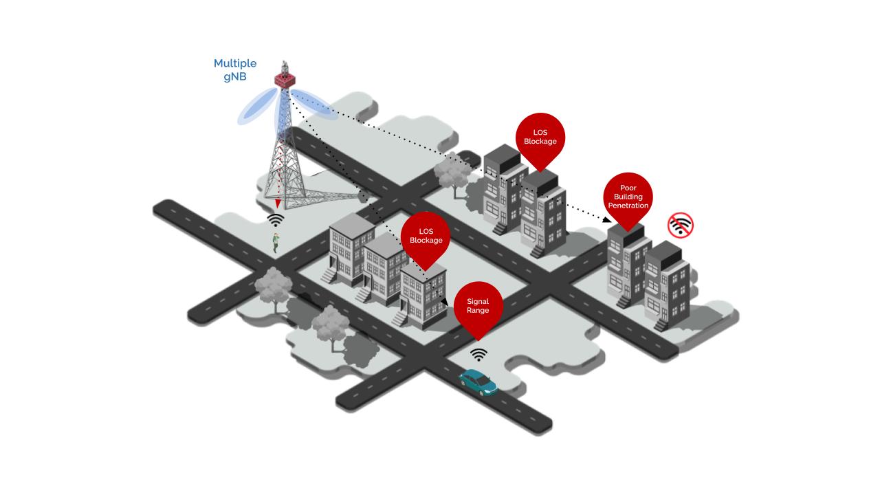 The enormous potential of mmWave technology comes with major challenges. Real-world mmWave network speeds vary greatly depending on range, signal blockers, and proximity to the nearest 5G tower or small cell. While mmWave 5G networks are ultra-fast, they’re also very short-range. To receive mmWave signals, users must be within a block or two of a 5G tower with no line-of-sight (LOS) obstructions. High-frequency mmWave signals are easily blocked by buildings, walls, windows, and foliage, further reducing the available 5G range (Figure 1). To optimize coverage, carriers are faced with installing numerous small cells in high densities, driving up the cost of deploying mmWave networks at scale.
